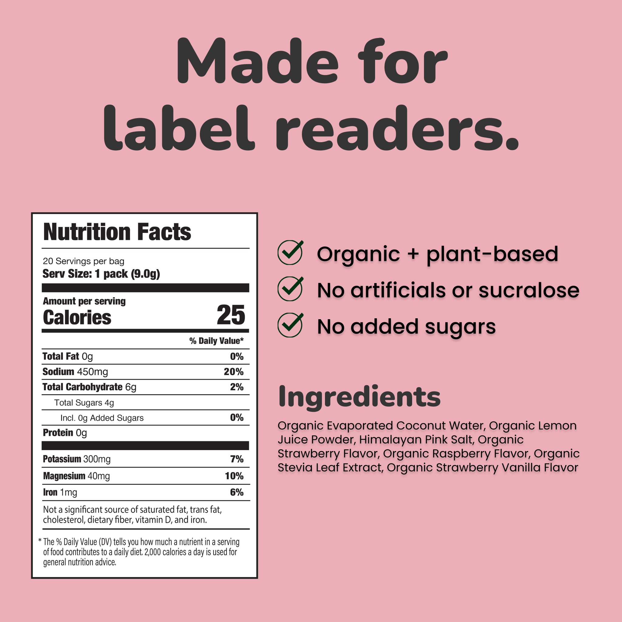 Most hydration powders are full of added sugars or artificial sweeteners, and even the better ones rely on synthetic minerals. Ours is made with coconut water and pink salt for clean, effective electrolytes—no added sugar, no gut issues, just fast hydration you can feel, anytime you need it.